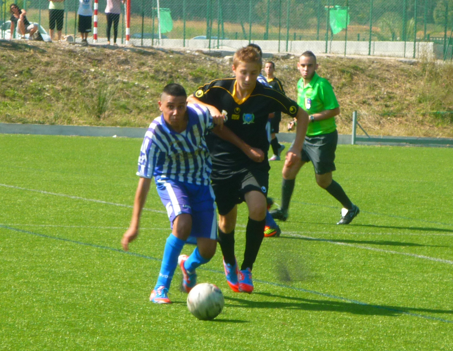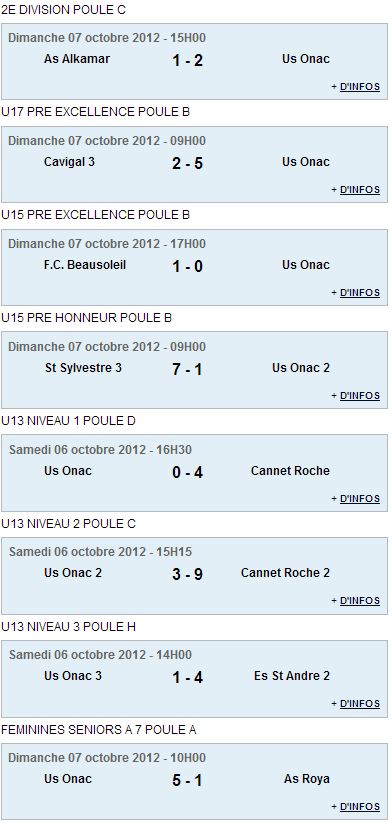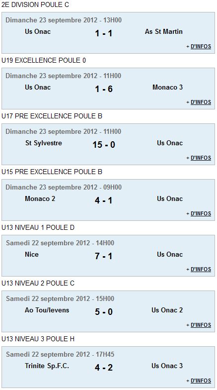 Le samedi, les U13 entamaient leur championnat. L'équipe de niveau 1 est allé s'incliner sur le térrain de l'OGCN, championne du niveau élite depuis 16 ans. c'est un groupe constitué de joueurs "première année" qui a ouvert ce championnat, sans démériter. L'équipe de niveau 2, qui a joué à huit aulieu de neuf joueurs, faute de licences à présenter à l'arbitre officiel, s'est incliné 5 buts à zéro contre Tourettes Levens. L'équipe de niveau 3, enfin, après un bon match face à l'équipe une de la Trinité, a craqué dans ls dernières minutes en prenant deux buts coup sur coup alors qu'ils tenaient le match nul.